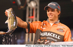 アラバマ州ルイス・スミス・レイクで開催されているWal-Mart FLW Tour第2戦は、予選ラウンドを通過した上位10名によるトーナメント2日めが終了。ウエイトをゼロに戻して競われたこの日、14Lb9ozのトップウエイトをマークしたのはマイケル・ベネット。「私は地元のカリフォルニアでスポッツを散々釣って育った。しかも、そこのスポッツはこのスミス・レイクから移入されたらしいから、釣り方も同じでよかったんだ」と語ったベネットは、岬やドック周りのデュープエリアをバークレイのフィネスワームでねらったという。なお、2Lb2oz差の2位にはスコット・カンターブリーがつけ、3位にはコビー・クレイガーがつけている。