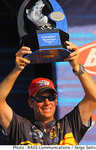 ケンタッキー州ケンタッキー・レイクで開催されたBASS Elite Series第8戦“Bluegrass Brawl”はトーナメントの全日程を終了。初日からトーナメントをリードしていたKVDことケビン・バンダムはこの日16Lb9ozとペースダウンしたものの、トータルウエイトを84Lb13ozとして一度も首位の座を明け渡さない“ワイヤートゥーワイヤー”で完璧な優勝を飾った。前日2位につけていたリック・クランは9位に後退、24Lb11ozを持ち込んで猛追したティミー・ホートンも1Lb1ozの差で2位に終わっている。「ホっとしたよ」とステージ上で語ったバンダムは2年前のこのレイクでトーナメントをリードしながら最終日に清水盛三さんの逆転優勝を許し、自身3位になった苦い経験が活きたと語った。バンダムのメインベイトはストライクキングのセクシーシャッドで、5シリーズと6シリーズを使い分けたという。また、フォローベイトとしてセクシースプーンを使用したと明かしている。バンダムはこの優勝でAOY争いでも1位に浮上。なお、日本人アングラーはAOYレースで桐山孝太郎さんが19位、清水盛三さんが23位、大森貴洋さんが50位、宮崎友輔さんが78位となっている。