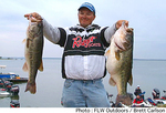 テキサス州ファルコン・レイクで開催されているストレーンシリーズ・テキサスディビジョン第1戦はトーナメント2日めを終了。明日の最終日に進出する上位10名が決定した。前日39Lb1ozというビッグウエイトをマークしてトーナメントをリードしていたリチャード・ケーシーは、この日22Lb1ozとウエイトを伸ばせず3位に後退。替わって首位に立ったのはこの日34Lb9ozをウエイインしたダン・シューンベルド。シューンベルドはルイジアナ州在住ながらこのレイクでガイドを行なっているため、ここを知り尽くしているアングラーの1人だといえる。ねらったのはクリークチャンネルのグラベルボトムで、プリスポーンやアフタースポーンのバスの通り道になっているスポット。ここをキャロライナリグのブラッシュホッグで、バイトがあった水深は18〜26ftだったと明かしている。