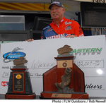 ジョージア州クラークスヒル・レイクで開催されたFLWシリーズBPイースタン第4戦はトーナメントの全日程を終了。トーナメントリーダーとして最終日に臨んだトム・マン Jr.は14Lb9ozをウエイイン。これがこの日のトップウエイトとなり、2位に10Lb以上の大差をつけて危なげなく優勝を果たした。今回のメインベイトでユニークだったのは、ズームのフルークを2つセットしたリグ。これはスイベルを介し、二股状にした長さのやや異なるリーダーにフルークを1つずつセットしたもの。これは2尾のバスを同時にねらうものではなく、水面下をベストなスピードでジャークするためだったという。「普通にベイトを1つセットしただけでは、私のジャークでは速すぎて水面から飛び出てしまったんだ。タンデムにしたことでベイトフィッシュと同様の理想的なスピードを再現することができたんだよ」と語った。マンはこの優勝と同時にAOYを獲得している。