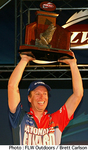 ミズーリ州テーブルロック・レイクで開催されたFLW Tour 第2戦はトーナメントの全日程を終了。予選を勝ち抜いた上位5名によって競われたこの日、暫定首位のブレント・エーラーは16Lb13ozをウエイイン。これは5名中2番手のウエイトだったが、前日までのビッグリードが功を奏して2位に13Lb以上の差をつけて悠々の逃げ切りに成功した。「こんなトーナメントは初めてだった。毎朝、釣りに行くのがこんなにエキサイティングだったこともね」と興奮気味に語ったエーラー。水深15〜25ftにステージングするプリスポーンをねらったというエーラー。メインベイトは1/4ozジグヘッドリグのゲーリーヤマモトの5inグラブとスイムセンコー、またラッキークラフトのRC2.5を使用したと明かしている。
