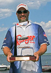 ニューヨーク州レイク・シャンプレインで開催されたFLW American Fishing Seriesノーザンディビジョン第2戦はトーナメントの全日程を終了。予選を通過した上位10名によって競われたこの日、トーナメントリーダーのトム・ベリンダは17Lb5ozをウエイイン。前日ベリンダとウエイトで並んでいたビル・スペンスは17Lb3ozとわずか2oz及ばず、この結果ベリンダが優勝を達成した。強風によるラフウォーターに見舞われたこの日、ベリンダは片道3時間半をかけて自らのエリアに向かったという。釣りができたのは実質2時間ほどだったというが、この決断が優勝をもたらしたといえるだろう。メインベイトはDirty Jigsの5/16ozスイムジグ、ストライクキングのレイジクローをトレーラーとして使用したと明かしている。