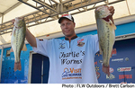 ミズーリ州テーブルロック・レイクで開催されているFLW Tour第3戦“Majors”はトーナメント3日めを終了。明日のファイナルに進出する上位10名が決定した。前日までのリーダー、カイル・ウェルチャーはこの日4尾のウエイインに留まり、5位に後退。替わって首位に立ったのは、前日6位につけていたブレント・ロング。この日のヘビエストウエイトとなる22Lb3ozをウエイインしたロングはトータルウエイトを58Lb15ozとし、 2位のステイシー・キングに3Lbの差をつけて明日の最終日に臨む。「新しい魚が私のエリアに上がってきていた。2尾いい魚をミスしてしまったので、あれをキャッチできれば30Lbもいけたと思うよ」と語ったロングは、濁りのあるスポットでのフリッピングをメインパターンとしていたという。以下、上位陣は3位ジェイソン・クリスティ、4位スペンサー・シャフィールド、5位となっている。日本人アングラーでは深江真一さんが109位で大会を終えた。