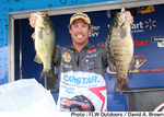 ニューヨーク州1000アイランドで開催されているEverStart Series Northern Division第3戦はトーナメント2日めを終了。明日のファイナルに進出する上位10名が決定した。前日のリーダー、ジェイミー・ハートマンはこの日19Lb8ozとまずまずのウエイトだったものの、2位に後退。ハートマンを上回る勢いを見せたのが、前日8位につけていたデレック・ストラッブだった。この日のレコードウエイト21Lb13ozをマークしたストラッブはトータルウエイトを42Lb7ozとして首位に躍り出た。以下、上位陣は3位ジョー・ルカレッリ、4位ボブ・イズミ、5位ビル・チャップマンとなっている。