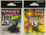 「DECOYシンカーtypeスティックDS-6」(写真左)は、高いスナッグレス性が特徴のスティックタイプシンカー、通常のダウンショットリグに使用できるのはもちろん、上のオープンスイベルと併用することでゼロダンシステムにも対応。