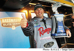 ジョージア州レイク・セミノールで開催されたB.A.S.S. Elite Series 第1戦はトーナメントの全日程を終了。予選を通過した上位12名で競われたこの日はストームの到来のため予定よりウエイインが早められたが、トーナメントリーダーのブレット・ハイトは25Lb15ozをウエイイン。トータルウエイト97Lb10ozで他を圧倒しての優勝。ハイトはこれでFLW TOUR開幕戦に続いての優勝という快挙を達成した。メインパターンはプリスポーナーをねらった3/8〜1/2ozのチャターベイトで、トレーラーには4.5inのスイムセンコーを使用したと語っている。また、暫定7位でファイナルに臨んだ大森貴洋さんは19Lb14ozをウエイイン。トータルウエイト78Lb4ozで4位入賞を果たし、初のAOY獲得に向けて会心のスタートを切った。