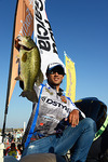 千葉県利根川で開催されたBasser ALLSTAR CLASSIC 2015はトーナメントの全日程を終了。木枯らし1号が観測されたこの日は朝から強い風に見舞われた。前日とは異なる天候の中、この日は3名がリミットを達成。前日のトップウエイトをマークした吉田秀雄さんは1510gとウエイトを伸ばせず7位に後退。この状況の中、観客の度肝を抜いたのは前日3位につけていた青木大介さん。リミットメイクに成功した青木さんのウエイトは2570gのビッグフィッシュを含めて6010g。トータルウエイト9530gで圧倒的な逆転優勝を果たした。以下、2位福島健さん、3位並木敏成さん、4位小森嗣彦さん、5位大塚茂さんという結果となった。ウイニングパターンを含めた大会の詳細は11月26日発売のBasser1月号に掲載される予定となっている。大会に関する詳細は主催のつり人社公式サイトおよびBasser編集部によるオフィシャルブログにて。