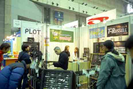 「ARMFLEX」などを扱うアングルのブース。ルアーだけでなく、フライ用品や各種セルフメイキング素材などの展示もあった。 |
