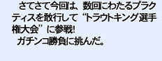 あれから2年ほどが経過した。自分では「結構ウマくなったんとちゃうの」と思っていた矢先、このトラウトキング選手権大会(以下:トラキン)の開催をインターネットで発見してしまった。