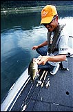 「まず、ウイードのアウトサイドエッジとブレイクを意識して、3/8ozのラバージグを使いました。ウイードエッジにキャストして、カーブフォールでボトムまで落とす方法ですね。その後、さらにシャローに入って、ウイードの上にワームを置く方法でやりました。どちらもウイードのシェード、ブレイクのシェードをねらっていました」。 |
