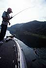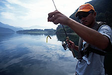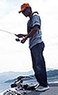 取材日、川口さんが最初にボートを進めたエリアは岬からワンドになったエリアだったが、運悪く、コイ釣りをしている人のラインが入っていたため、岬には入れなかった。そのため彼がとった方法が、このシェードパターンであった。このとき、川口さんが使用していたのはラバージグだった。