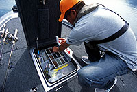 | ワッキーリグに使用するのは、ゲーリー・ヤマモト社のカットテールワーム。カラーはナチュラル系のソリッド系。ディープにこのリグをノーシンカーでフォールさせる場合、ウイードの背丈を考えること。ウイードとトップの背丈でバスのレンジが変わる |