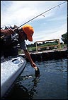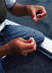 「夏の朝一番はトップで楽しんでほしいですけど、日ざしが強くなったきたらパターンを考えた釣りになります。中でもラバージグ、ノーシンカーのワッキーリグ、ダウンショットリグ、軽量ジグヘッドは外せない。ワッキーリグの使い方ですが、多用しているのはカットテールなんですけど、フックをセットする位置が重要ですね。ワームボディーの真ん中に膨らんだ部分がありますよね。あれの上から5mmくらいのところにフックを刺します。適当にセットするとイトヨレができしてしまうので、アタリが取りにくくなったり、アワセが上手くいかない場合がある。アクションはウイードの上に乗せて、フワッと持ち上げるだけです。 |