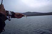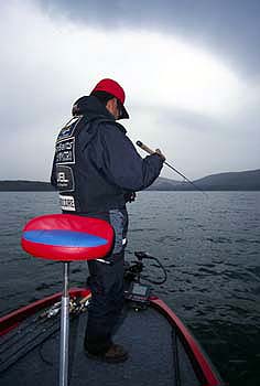 最初にエリアとして野本さんが向かったのは、第2水中島だった。GPSを持たない野本さんであるが、同湖のインビジブル・ストラクチャーの場所は、98%熟知しているという。これも、山中湖に移り住んで7年、ガイド業の傍らトーナメントに参戦する者の財産だ。あとの2%はというと、漁師たちが意図的に沈める魚礁である。新しく沈めた魚礁は、わからなくとも当然であるが……。