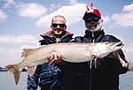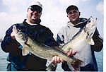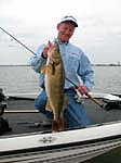 ウオールアイは10〜15ポンドに成長するので、6Lbsラインで釣るというのは、まさにエキサイティングだ。しかも、ディープでバイトがあったときには、ファイトの時間もかなり長く楽しい。深さの話が出たのでついでに書くが、デトロイト・リバーは最深部で60ftくらい。私が今までに一番深いところで釣った経験は55ftだったが、平均して12〜30ftの深さにウォールアイのスクールがいるケースが多い。 |