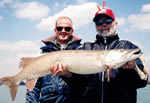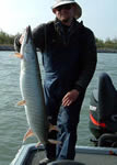 お客さんがスモールマウスをフックアップした。ロッドの曲がり方からして2Lbクラスだった。するとバスは、ボートの方向に向かって猛スピードで泳ぎ出した感じがした。ロッドのテンションは弱まるし、ラインを巻き取るスピードもおぼつかない。「オォォーーッ」などと言っていると、今度はピタリと止まった。